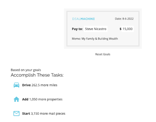 For example, to achieve my stated goal of earning $15,000 in a 3-month period, DealMachine estimates that I'll need to drive over 200 miles, add 1,050 properties to my list of leads, and send more than 3,000 pieces of direct mail to homeowners.