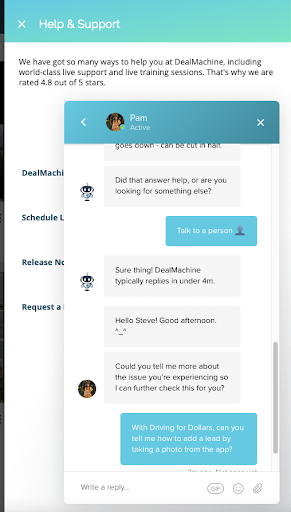 I tried to reach an actual person at DealMachine for help during my free trial, and while there's no phone number to call, I able to reach an employee in about 3 minutes via live chat (quicker than the company's average response time of 4 minutes).