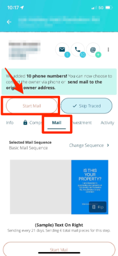 I was surprised to see how fast and easy it was to send postcards to homeowners. Once you've got a property pulled up on your app or browser, you just click on "add lead" and then "start mail" – no post office visits required.