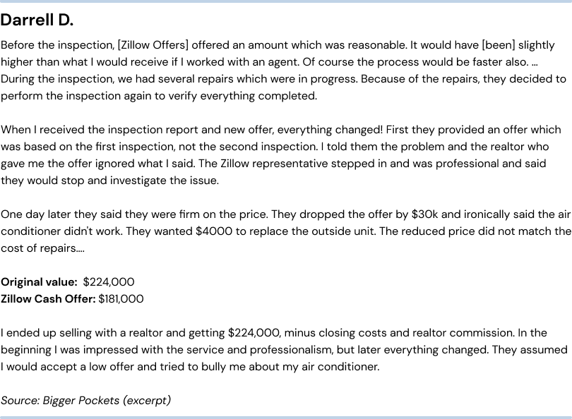 However, other Zillow Offers reviews came from sellers who felt they'd been duped by a bait-and-switch.