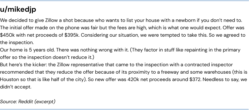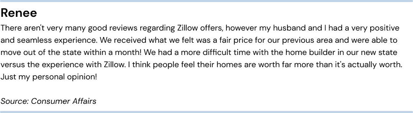 Another customer had the same experience according to this Zillow Offers complaint. Because of their experience, they ended up selling with a real estate agent.