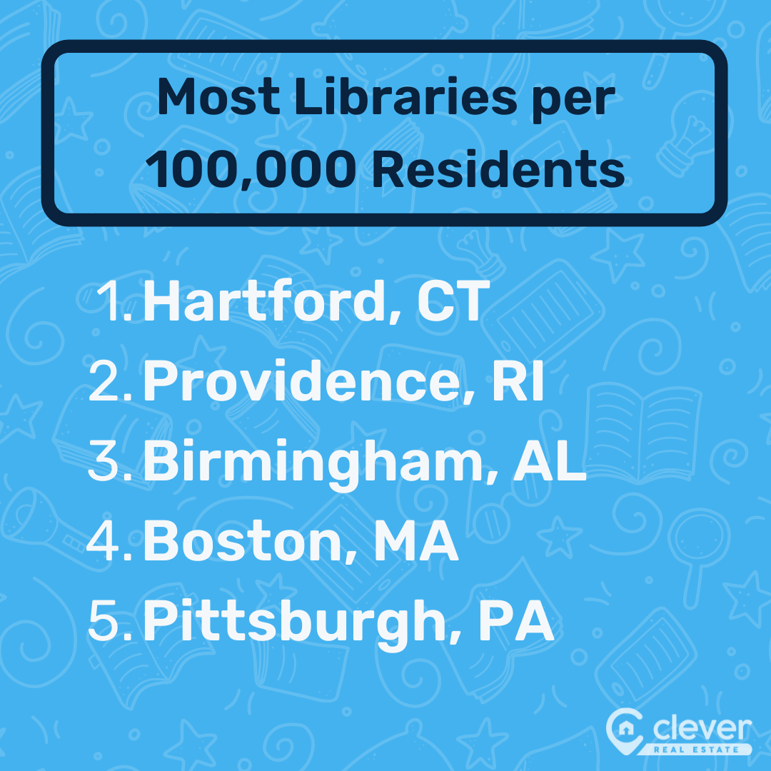 | 🔢 Dewey Decimating Hartford is home to 9.9 libraries per 100,000 residents – the most libraries per capita of any metro and 111% more than the average city in our study (4.7). |