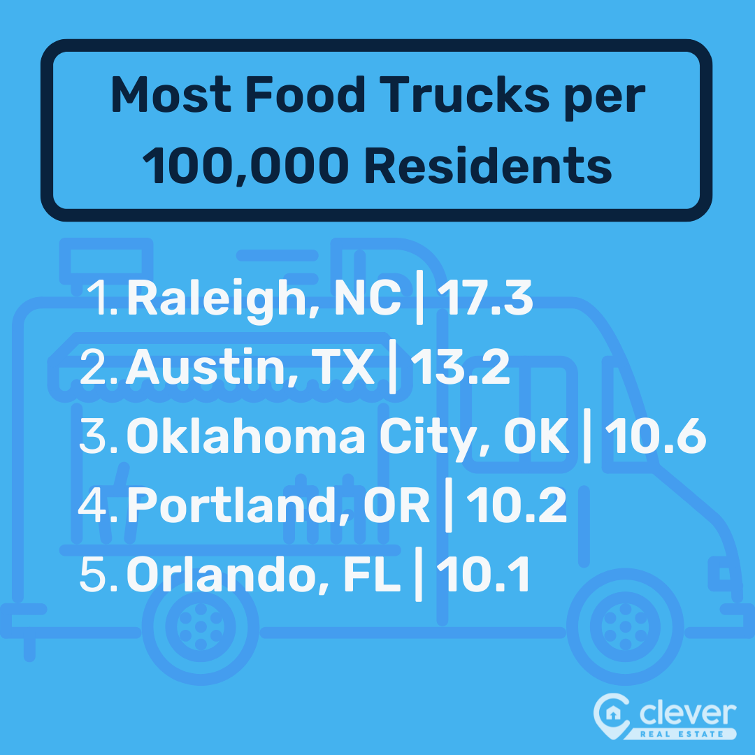 | 🚚 Which city has the most food trucks per capita? 🚚Raleigh, North Carolina, is the best city for food truck crawls, averaging 17 food trucks per 100,000 people. |