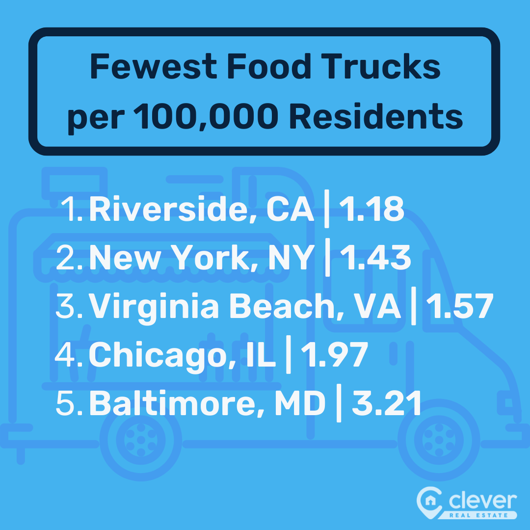 - Food trucks all over town: The top 15 cities have an average of 8.7 food trucks per 100,000 residents. Compare this to the average city in our study, with 6.1 food trucks per 100,000 residents — a 43% difference.
