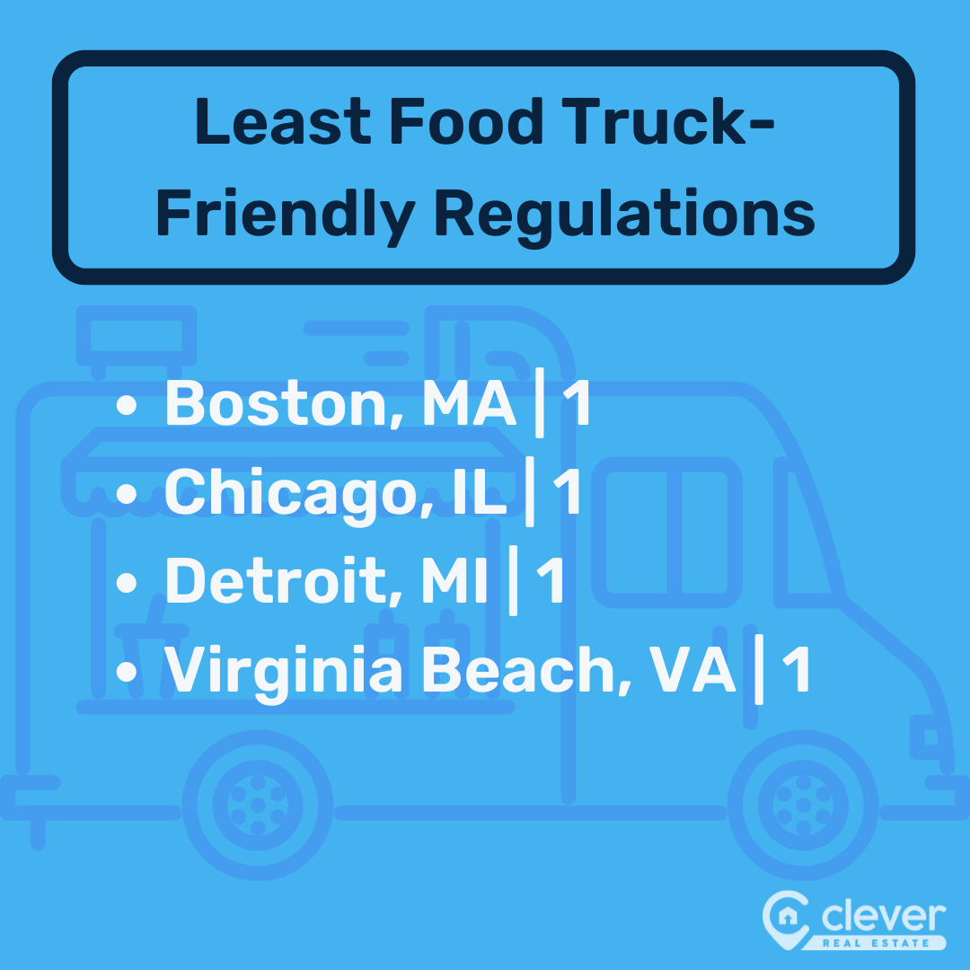 Barriers in all the bottom cities range from restrictive zoning laws we mentioned and confusing requirements to expensive application and licensing fees. This in turn results in these cities not having very many food trucks to enjoy.