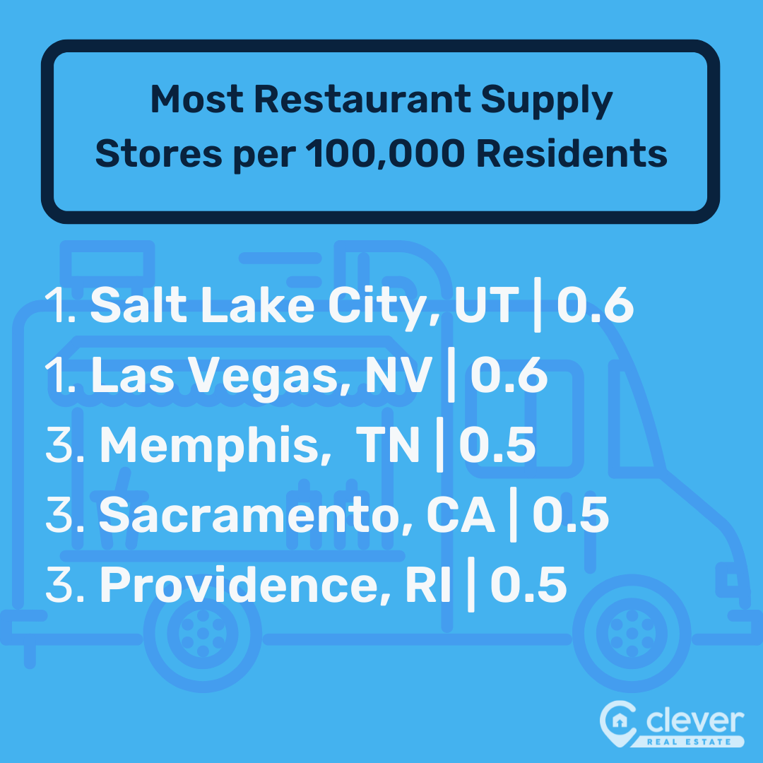 | 🎛 SLC's Got Ya CoveredSalt Lake City has the most restaurant supply stores per 100,000 residents out of every city in our study. At 0.6 stores per 100,000 residents, that's 200% more than the average city, which only has 0.2. |