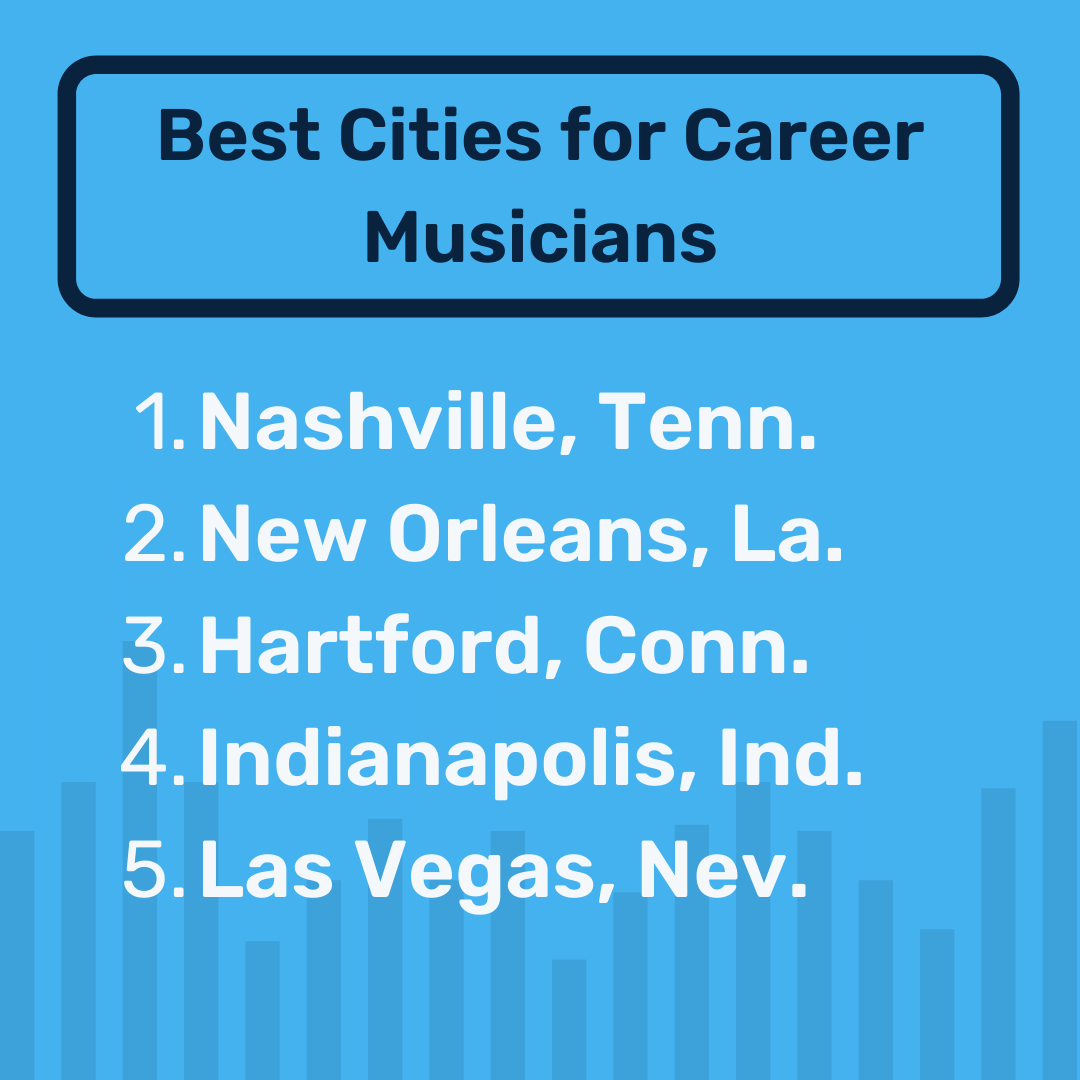 • Nashville also tops the charts as the best city for working musicians. Career performers can expect to earn an average of $28.81 hourly.