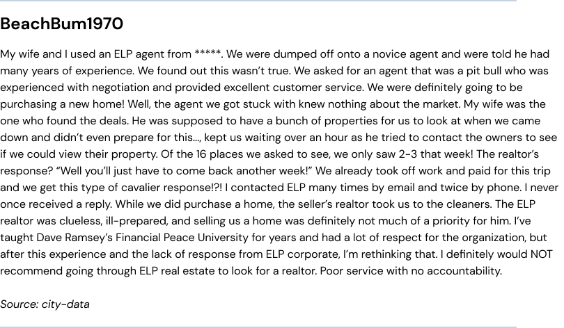 This customer, for example, thought they were getting an aggressive and experienced realtor, but instead they ended up getting a real estate agent with minimal experience: