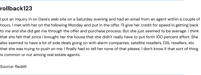 This customer felt that their real estate agent didn’t put enough effort into their real estate transaction and was constantly trying to upsell them on other products: